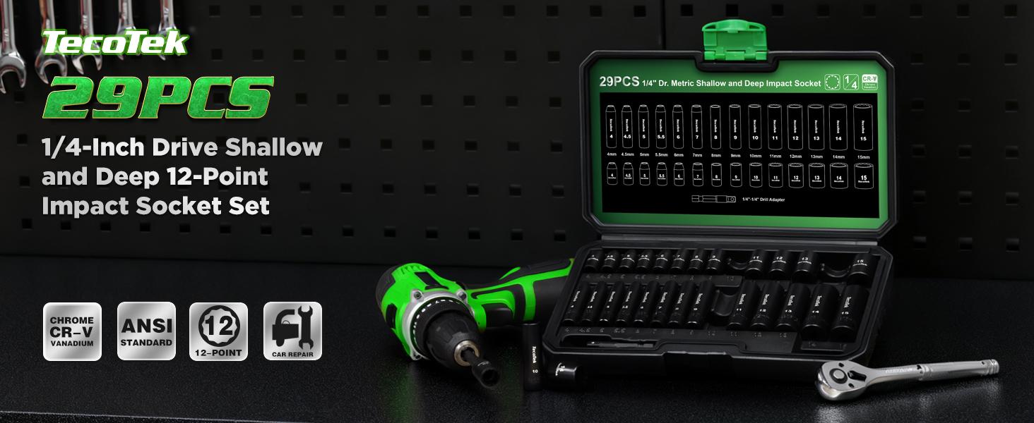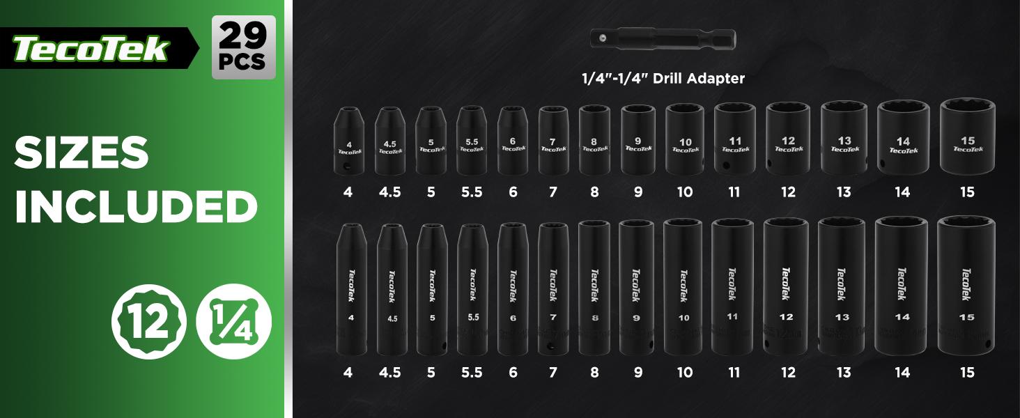 Tecotek 29 Pieces 1/4-Inch Drive Shallow and Deep 12-Point Impact Socket Set, CR-V, 4-15Mm Metric, 1/4"-1/4" Drill Adapter